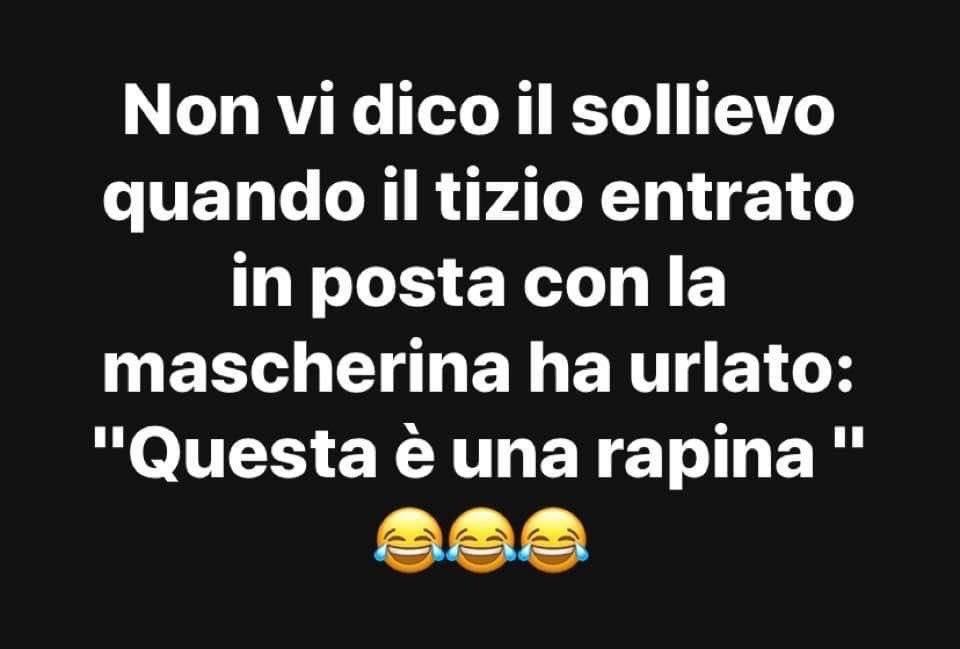 Pochi giorni dopo la diffusione del Coronavirus, ho visto in Internet questa scritta che diceva: non vi dico il sollievo, quando il tizio entrato in posta con la mascherina ha urlato: “Questa è una rapina!”.